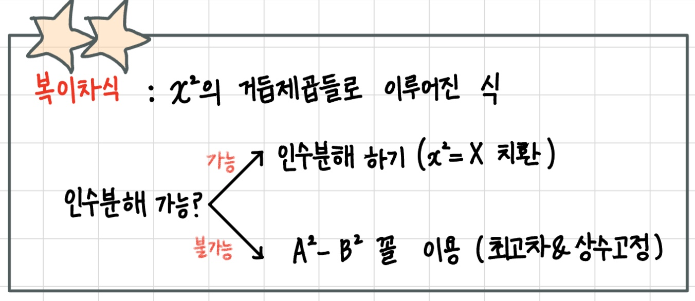 $x^2$만 언급이 되어있긴 하지만 넓게 보았을 때, 문자가 여러개이더라도 짝수차로만 이루어져 있다면 복이차식 풀이를 통해 풀어줄 수 있습니다.