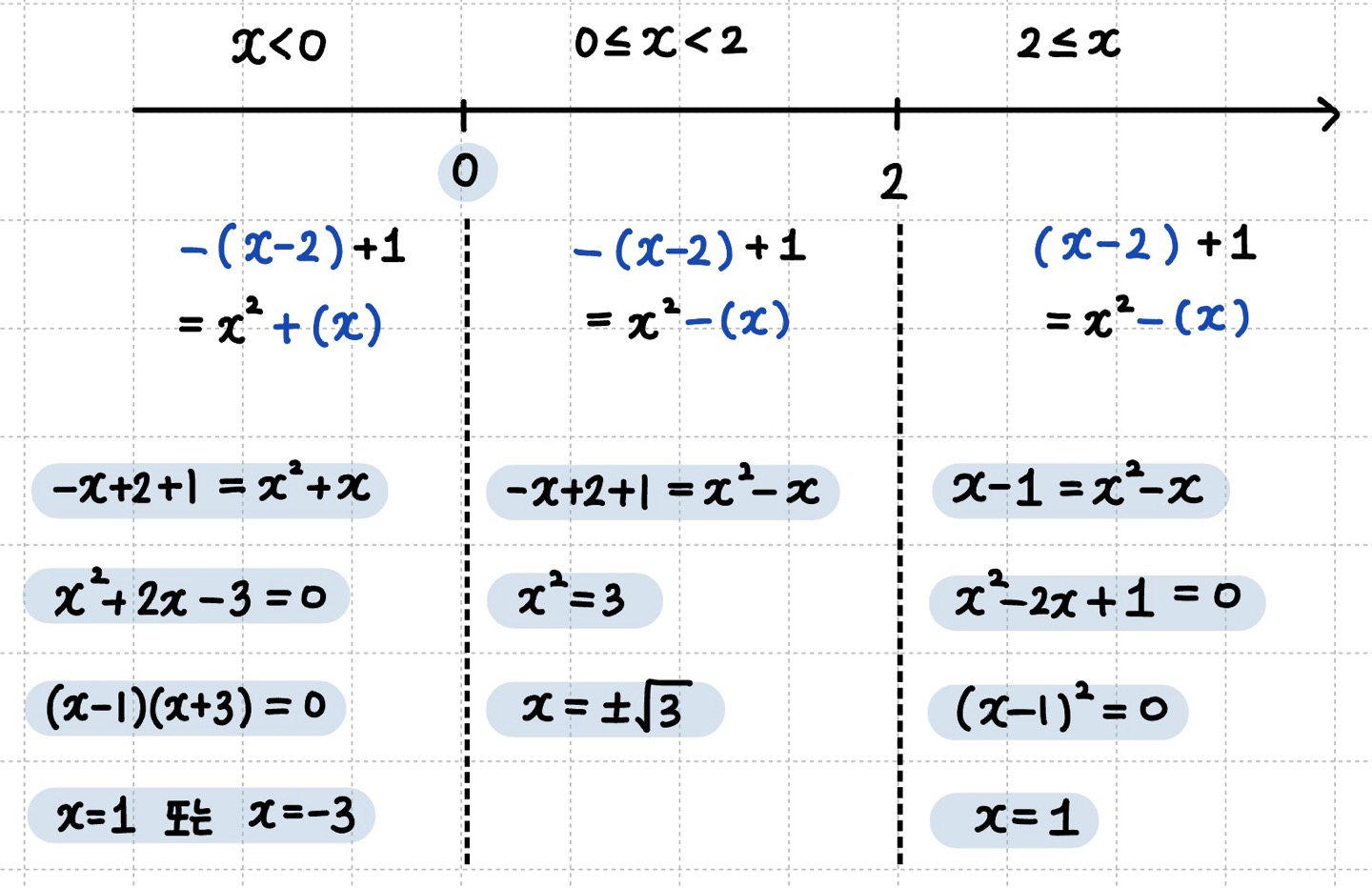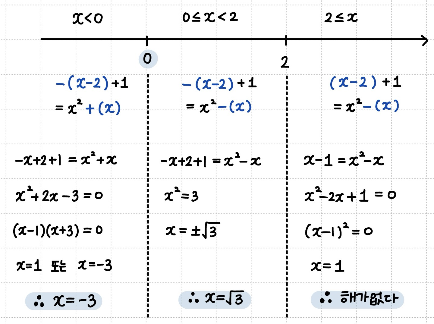 - $x \geq 1$ 경우만 생각하는 것이므로 $\therefore x = 1, x = 3$