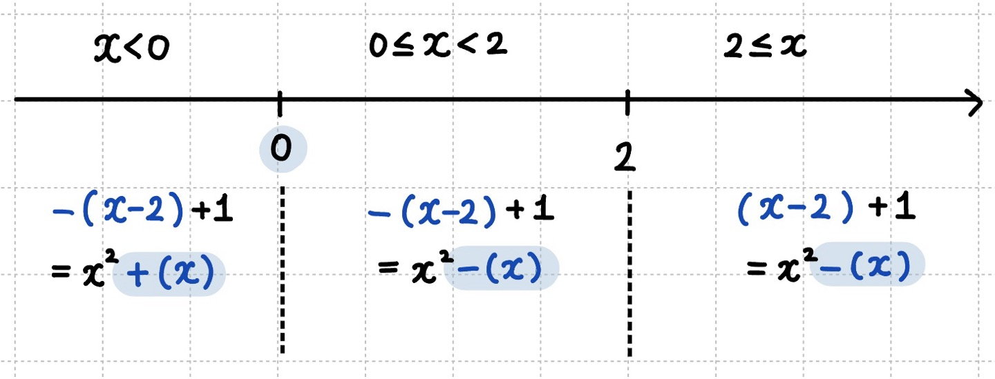 $x$가 $0$과 $2$일 때 각각의 부호가 변화하므로 $x < 0$, $0 \leq x < 2$, $2 \leq x$로 범위를 나눠 줍니다.