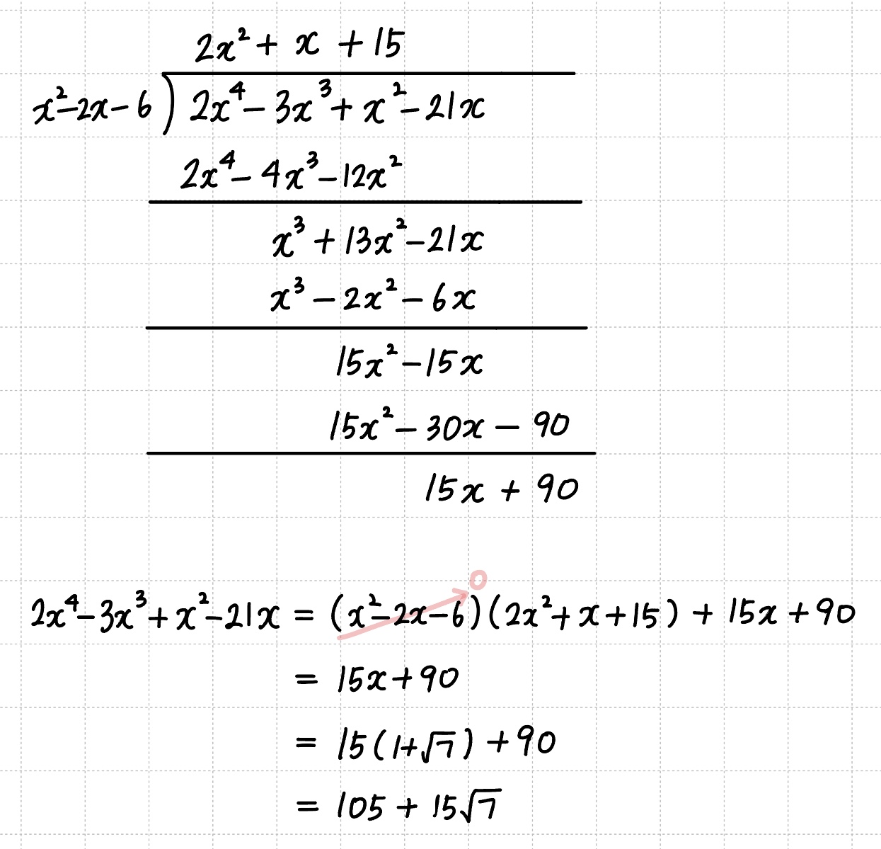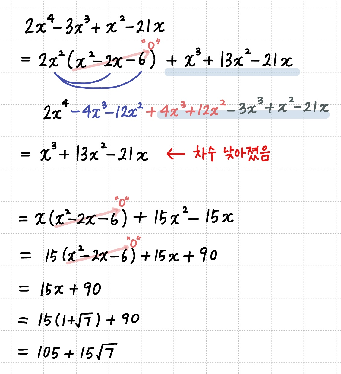 직접 나눠 (나누는 식)X(몫)+(나머지) 꼴로 바꿔 준 후 $x^2 - 2x - 6 = 0$이므로 (나누는 식)X(몫)=0 으로 나머지만 남게 됩니다. 이 식을 얻기 위해 직접 나누기 방법을 해줬던 것 입니다.