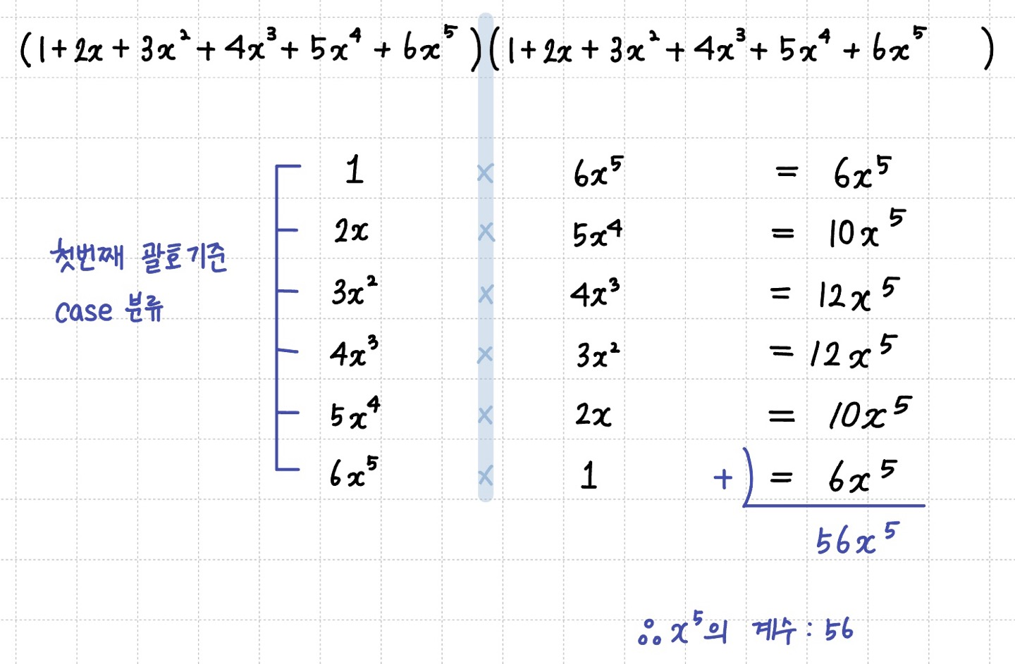 즉, $x^5$ 항만 궁금하다면 $(1 + 2x + 3x^2 + \cdots + 100x^{99})^2 \approx (1 + 2x + 3x^2 + 4x^3 + 5x^4 + 6x^5)^2$