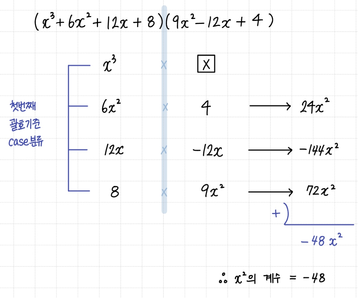 - 이후 각각의 케이스에서 $ x^2 $ 만들어지는 항을 적고 계산하여 답을 구해 줍니다.