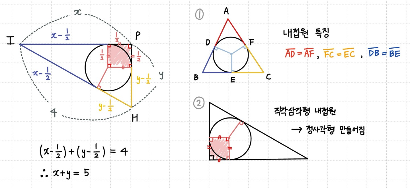내접원 반지름과 내접원 특징을 이용해서 선분IH길이가 4라는 점을 이용해 $x, y$ 관련식을 한개 더 뽑아 줍니다.