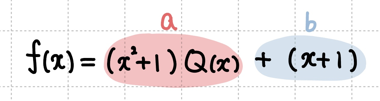 따라서 $b^2$만 나머지로 남게 됩니다. - $b^2 = (x+1)^2 = x^2 + 2x + 1$인데, 나누는 식 $(x^2+1)$은 2차식이고, 나머지도 $x^2 + 2x + 1$로 2차입니다.