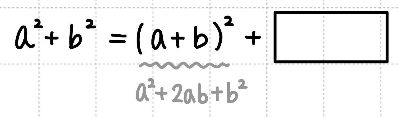 • 좌변의 $a^2 + b^2$이 되기 위해 $(a + b)^2$ 상태에서 한 칸 내려와 줘야 하므로 네모는 $-2ab$.