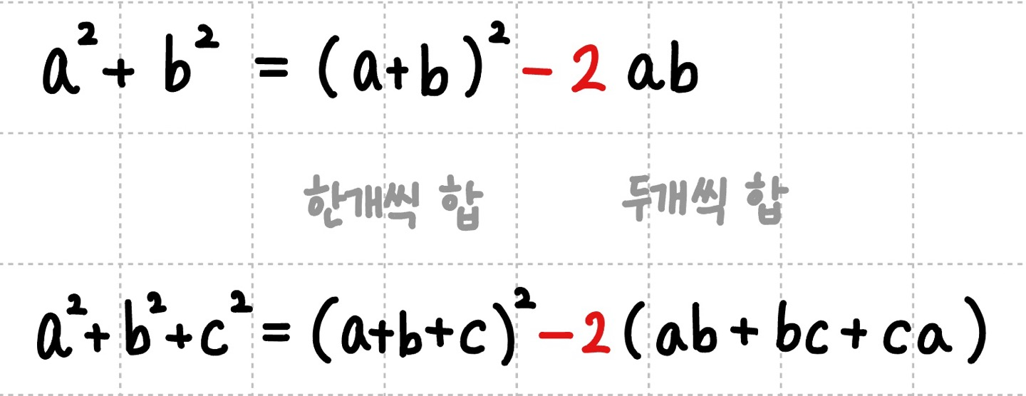 • $a^2 + b^2 + c^2 = (a + b + c)^2 - 2(ab + bc + ca)$ 공식 이용