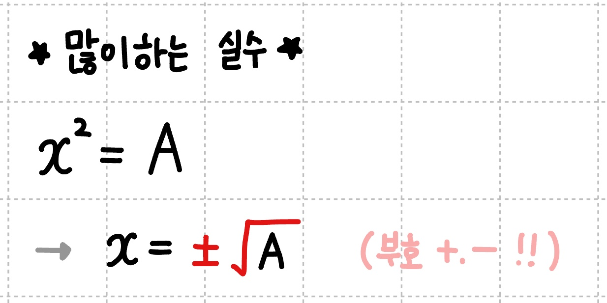 많이하는 실수 - $x^2 = A $ $\therefore \quad x = \pm \sqrt{A}$