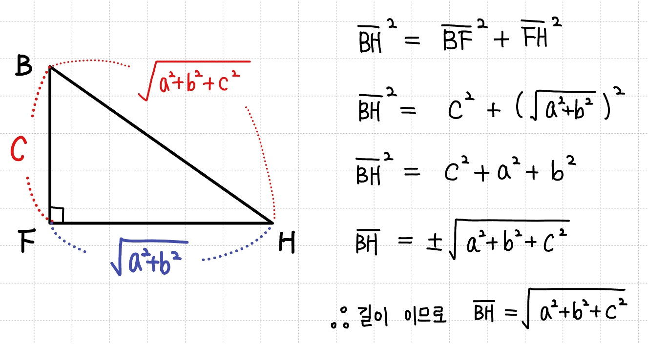 • 이 상자의 대각선 길이는? -> $ \sqrt{a^2 + b^2 + c^2}$ = ?