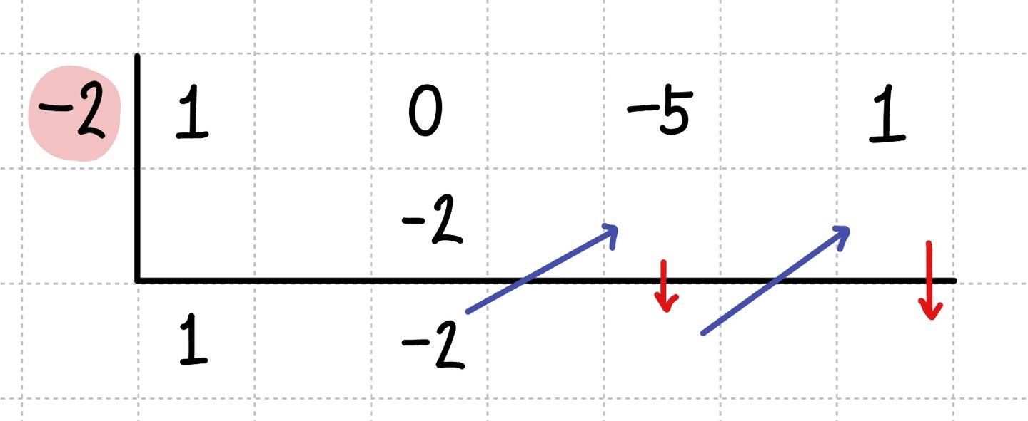 문제가 " $(x^3 - 5x + 1) \div (x + 2)$ 의 몫과 나머지를 구하시오." 였기 때문에 $ (x + 2)$가 나누는 식이라는 것을 알 수 있지만, 조립제법의 결과만 나와있더라도 어떤 식으로 나누는 지 알 수 있어야 합니다.