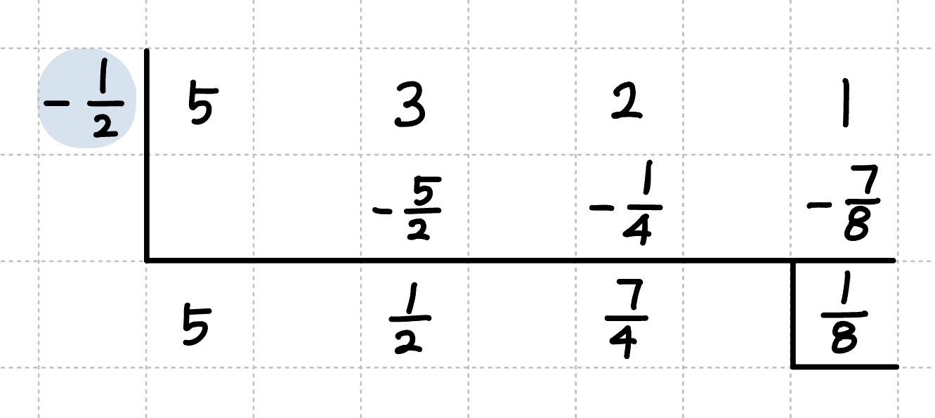 - 맨 왼쪽에 있는 수가 $-\frac{1}{2}$ 이므로 $x=-\frac{1}{2}$ , $x+\frac{1}{2}=0$ 즉, 나누는 식은 $x+\frac{1}{2}$ 이 됩니다.