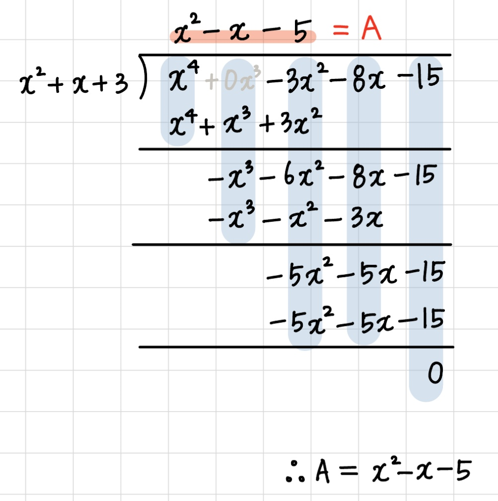cf) $A = (x^4 - 3x^2 - 8x - 15) \div (x^2 + x + 3)$ 처럼 한번 더 이항해서 A=으로 정리해 생각해셔도 됩니다.