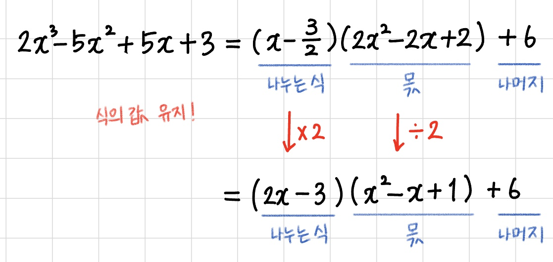 이후, 문제에서는 $(2x-3)$으로 나누는 식을 보라고 하였기 때문에, 식의 값은 유지한체 관점을 변형시켜 줍니다.
