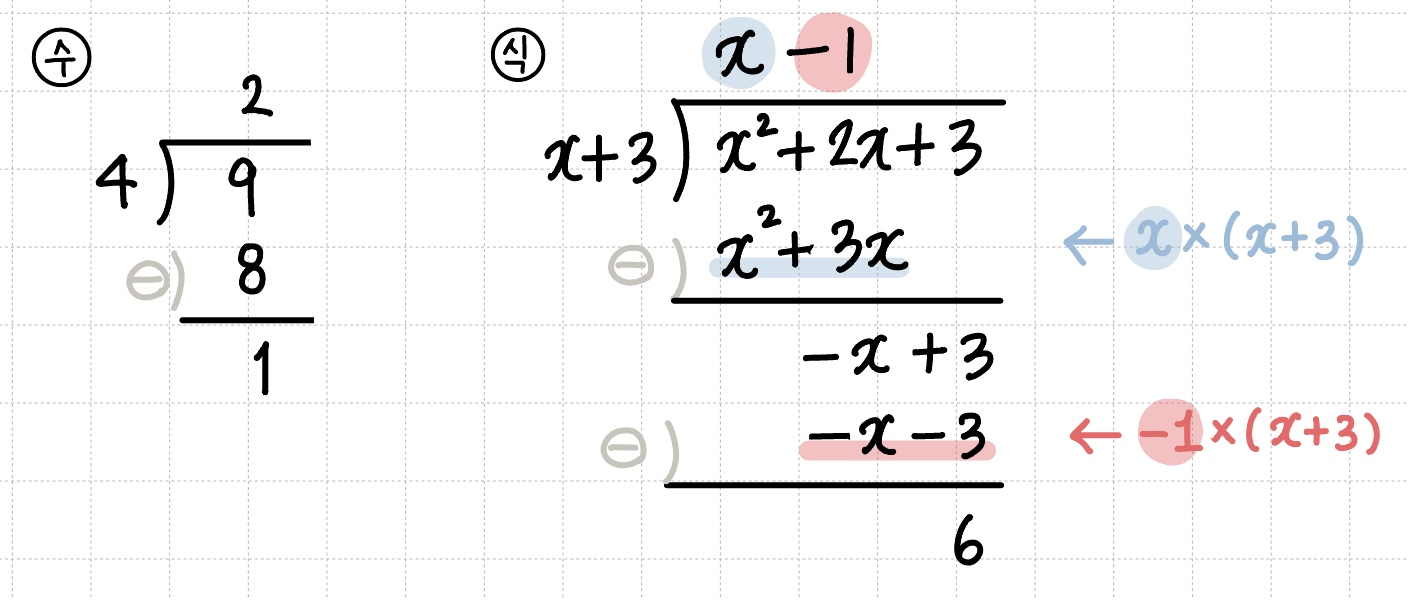 - 다항식에서도 수에서의 계산과 마찬가지로 끝까지 나눠 줘야 합니다.