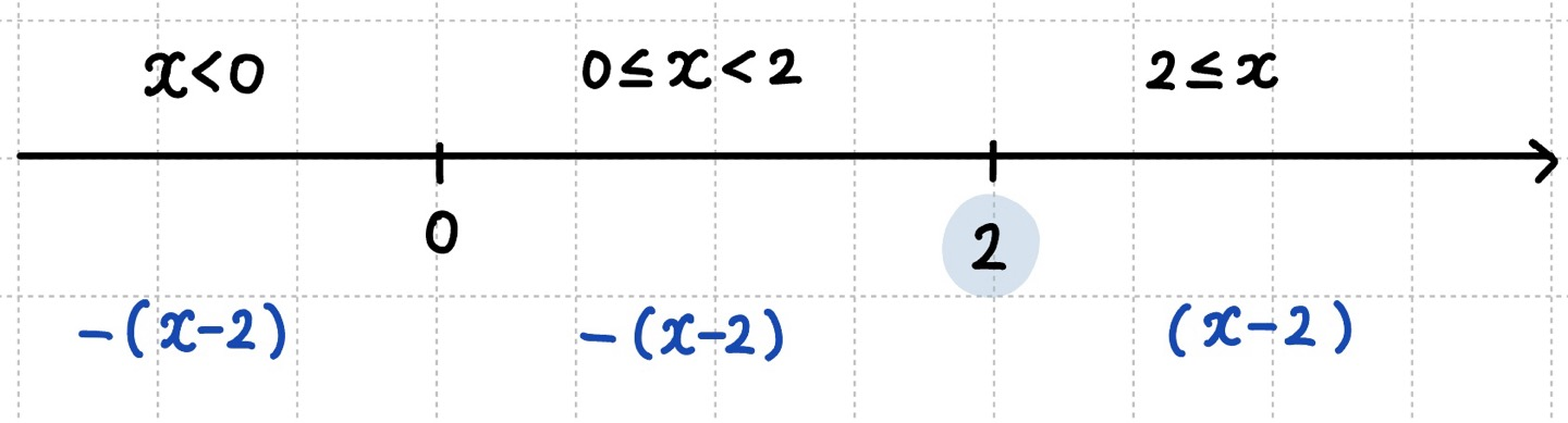 - $|x-2|$ : 2기준 왼쪽은 $-(x-2)$, 오른쪽은 $(x-2)$