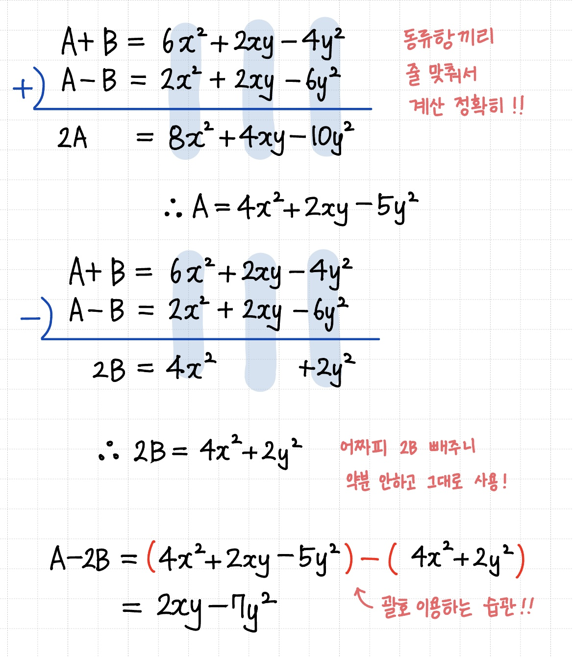이렇게 처음부터 동류항끼리 적어주는 연습을 해두시면 좋습니다. 그리고 이문제에서는 $2B$의 값을 빼주는 것이 였기 때문에 굳이 $B=$ 하고 약분하여 정리할 필요가 없습니다. 즉, 매 순간 문제에서 물어보는 것이 무엇인지 생각하면서 푸는 것이 중요해요. 다음 단계를 할 때 이 풀이를 하는 것이 필요할까?에 대해 생각해보도록해요. 아직은 어렵겠지만 차근차근 제 풀이와 비교해서 생각하는 힘을 길러보도록 합시다.